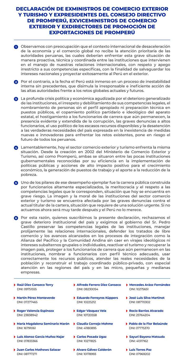 Firmaron el pronunciamiento los exministros de Comercio Exterior Raúl Diez Canseco Terry, Alfredo Ferrero Diez Canseco, Mercedes Aráoz Fernández, Martín Pérez Monteverde, Eduardo Ferreyros Kuppers, José Luis Silva Martinot, Edgar Vásquez Vela, Rogers Valencia Espinoza, Rocío Barrios Alvarado, Mara Seminario Marón y Claudia Cornejo Mohme,