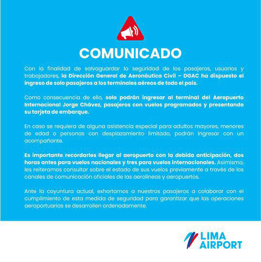 La concesionaria Lima Airports Partners ha confirmado que solo podrán ingresar al terminal del Aeropuerto Internacional Jorge Chávez los pasajeros que tengan vuelos programados. La entidad precisó que esta medida también se extiende a los demás aeródromos del país.