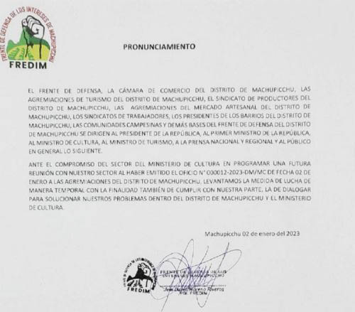 A través de un pronunciamiento, el Frente de Defensa de los Intereses de Machu Picchu (Fredim), con la firma de su presidente, David Moreno Riveros, comunicó a las autoridades nacionales y a la prensa regional y nacional, que ante el compromiso del Ministerio de Cultura, a través de su titular Leslie Urteaga, en programar una futura reunión con las organizaciones de Machu Picchu, levantan la medida de lucha de manera temporal, con la finalidad de dialogar para solucionar los problemas del distrito cusqueño.