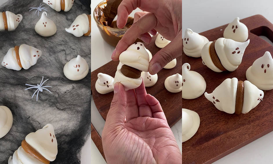 - Sacar los merenguitos del horno y decorarlos con chocolate derretido en base a diseños terroríficos de Halloween de tu elección.