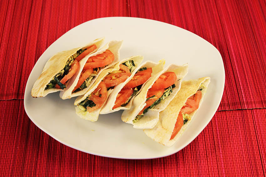 Esta receta es fácil y rápida de hacer. Primero colocar un tomate cortado en medias rodajas en un pan pita. En un bowl, mezclar ½ pechuga de pollo cocida y deshilachada, 100 g de espinacas crudas y picadas finamente, 2 tallos de apio picados en cuadritos, ½ cebolla blanca cortada en juliana, 50 g de maní tostado y picado. Todo esto revolver con una salsa casera, que consta de una cucharada de mostaza, 4 cucharadas de yogurt natural, pimienta, ½ cucharadita de sal y ½ cucharadita de AJI-NO-MOTO®.